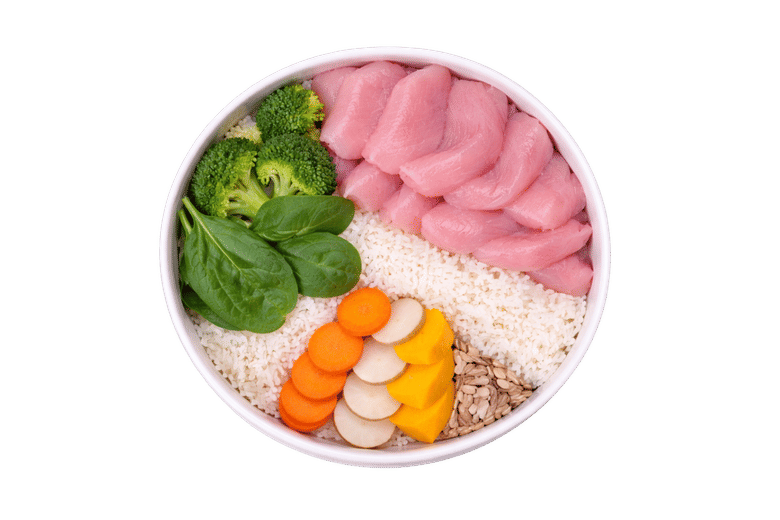 V tomhle receptu jsme mysleli na starší psy, psy s nadváhou a kastrované psy, kteří potřebují lehčí a dobře stravitelnou stravu. Základem je kombinace čerstvého a sušeného krůtího masa, které se dobře tráví a pomáhá udržet váhu pod kontrolou. Jako přílohu jsme zvolili rýži – lehce stravitelný zdroj energie, díky které je receptura cenově dostupnější a přitom si zachovává poctivé složení. Přidali jsme bylinky, zeleninu a prospěšná probiotika a vše šetrně uvařili na páře. Nechybí ani kloubní výživa. Obloukem jsme se přitom vyhnuli chemii, lepku a levným náhražkám.
